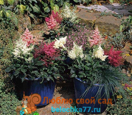 Посаженная в компании высокорослых цветов, астильба маскирует оголенные стебли своих соседей. Она относится к редким декоративным растениям, которые прекрасно растут и цветут в условиях недостатка солнца и избытка влаги. При необходимости можно посадить астильбы и под деревьями, но делать это нужно, отступив от ствола дерева не менее 1,5метров. При такой посадке корни дерева не повредятся и астильба не будет угнетенной.