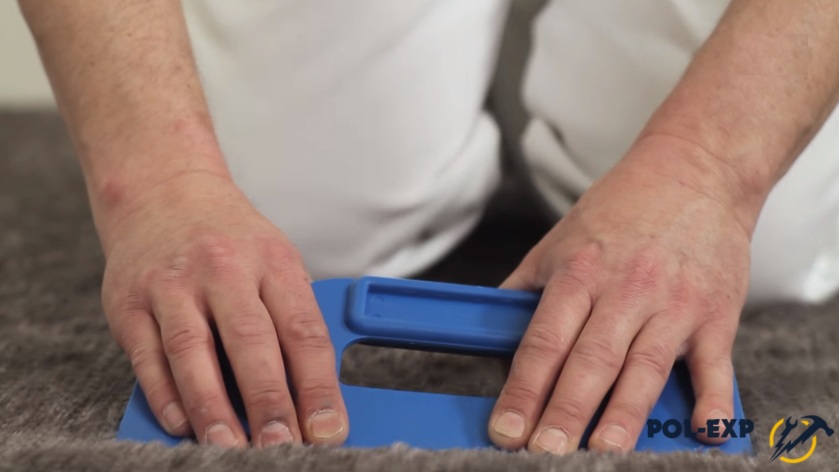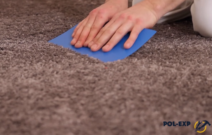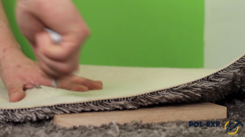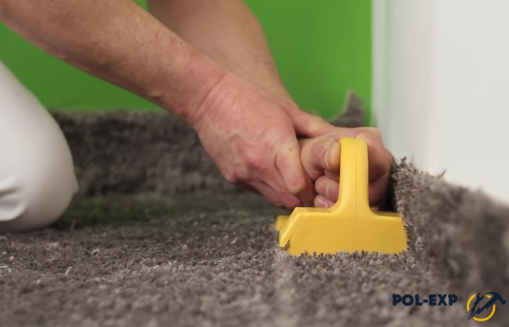 Шаг 3. По истечении 24 часов ковролин ровняют, тщательно разглаживают, особенно у стен, раскраивают. Резать полотно можно и обычным ножом, но удобнее использовать специальный инструмент – выравниватель.