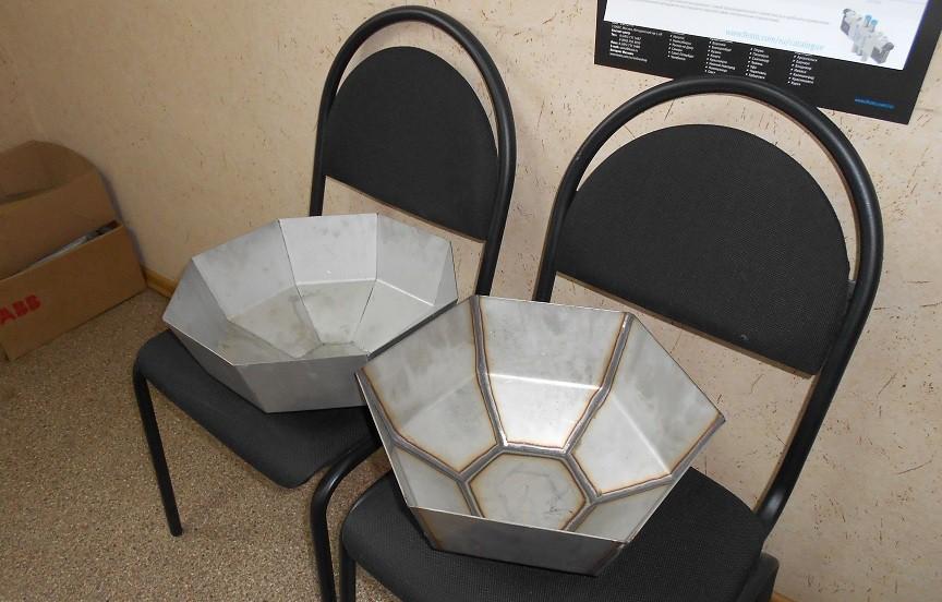 После замеров теорию проверяют на практике, изготавливая по чертежам чан из металла в масштабе, как показано на фото. Это необходимо для определения количества расходников и прочности шва.