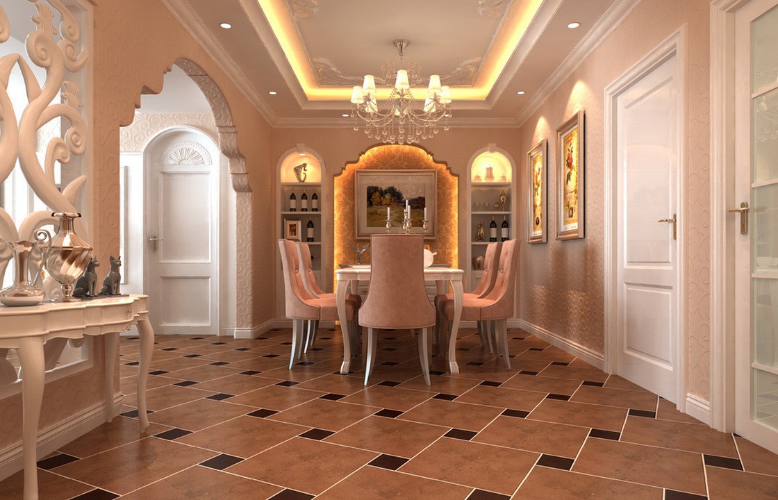 Для оформления пола используются: керамическая плитка, паркетная доска, паркет (ламинат, как эконом вариант) или наливные полы (монотонные, «под мрамор» или с ненавязчивым узором).