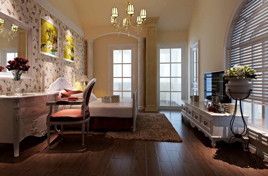 - Полы могут быть деревянными (паркет, террасная доска, качественный ламинат); керамическим или из искусственного камня. Цвет и дизайн таковых выбирают обычно независимо от основной палитры: здесь уместна самостоятельная композиция. Главной чертой остается симметричность и комфорт.