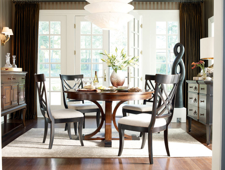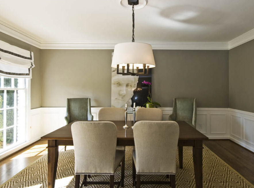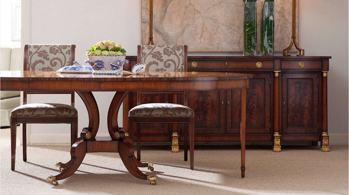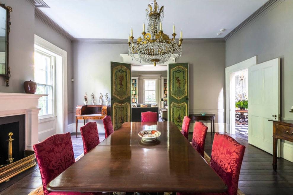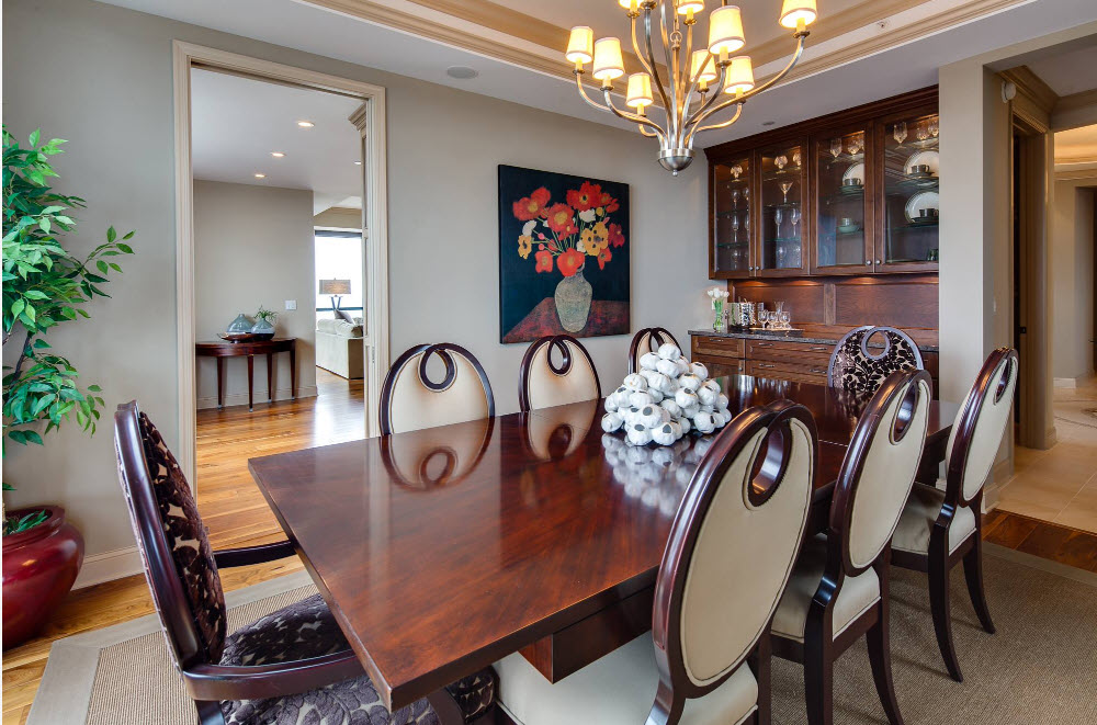 Основное внимание в оформлении столовой отдается созданию обеденной группы, остальные элементы интерьера становятся лишь фоном или сопутствующими предметами меблировки и декора. Представить себе неоклассическую столовую без вместительного стола из натурального массива дерева с красивыми резными ножками сложно. А вот стулья вокруг обеденного стола могут быть разными, даже выполненными в современном стиле, но с мягким оформлением сидений и чаще всего спинок. Дополняет картину респектабельного помещения для трапез роскошная люстра, расположенная непосредственно над обеденной группой.