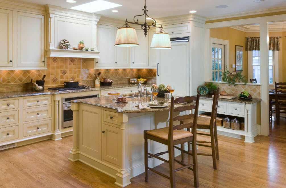 Уместны здесь и островные варианты рабочего гарнитура. Кухонные комплекты будут и традиционными, и современными одновременно. Остров может стать и импровизированной столовой: в неоклассицизме необязательно выносить обеденную группу, как в классическом помещении.