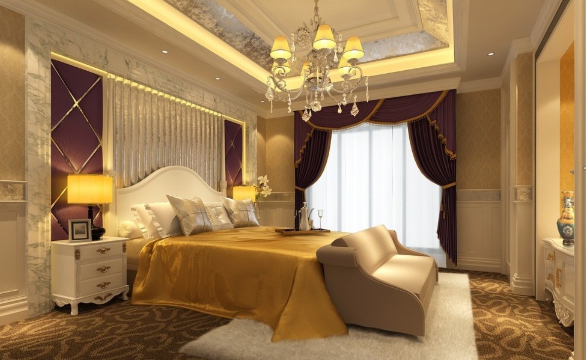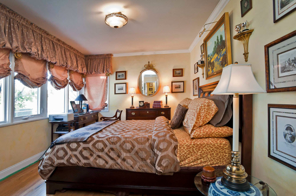 Большое внимание уделяется и текстильному оформлению. Избыточность здесь неуместна, а потому каждый элемент подбирается с особой тщательностью. Шторы прямолинейные, легкие, ниспадающие большими складками до самого пола. Основное требование, ткани для штор должны гармонично сочетаться с общим цветовым оформлением. Лучше предпочесть качественные дорогие ткани, которые красиво ложатся, образуя ровные поверхности, например: атлас, бархат, тафта, плотный шелк. Использование ламбрекенов, бахромы и подхватов с кистями – придаст дополнительную выразительность помещению. Красоту штор дополнят карнизы с живописной резьбой.