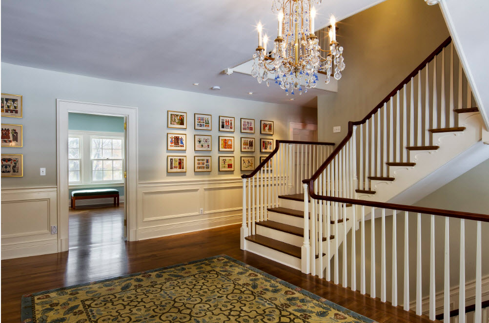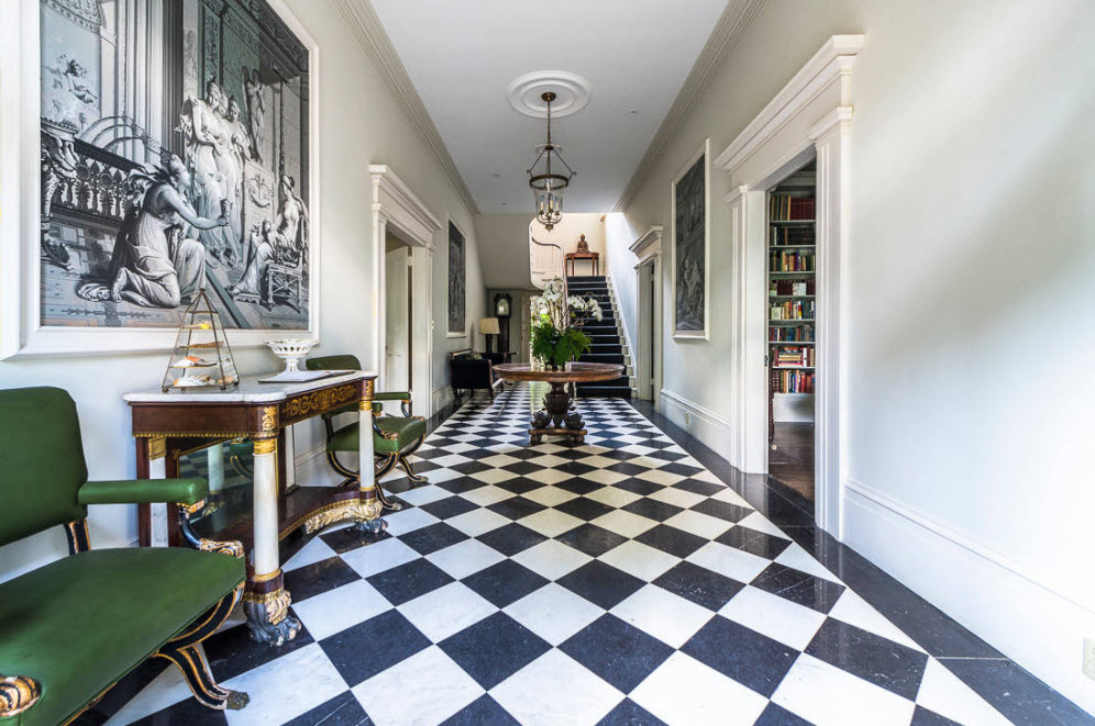 При выборе первого варианта оформления коридора или прихожей, а также пространства возле лестницы (в случае ее наличия), важным моментом становится выбор напольного покрытия. Классическая черно-белая «шахматка» в глянцевом или матовом исполнении становится культовым элементом неоклассического интерьера. Для поддержки столь контрастного исполнения полов необходимо выдержать отделку потолка и стен в нейтральных светлых тонах. Скромная лепнина на потолке, молдинги или ниши на стенах будут нелишними, в случае, если вспомогательное помещение имеет высокие потолки и большую площадь.