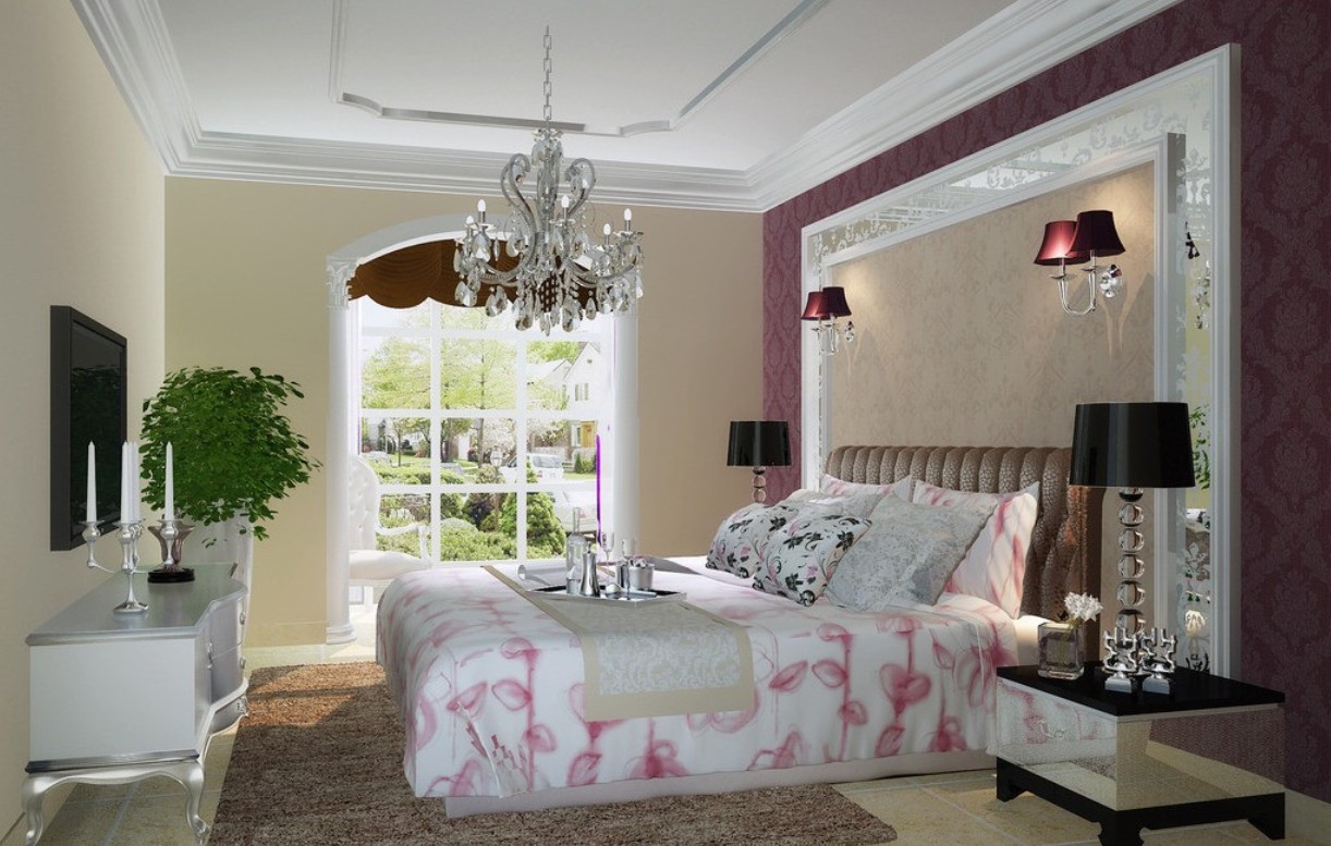 Неоклассический стиль отлично подходит для спальни средних и больших размеров. Главный элемент интерьера – спальное место, оформляется с должным почтением к роскоши натуральных материалов и красоте текстиля из благородного сырья, исполненного в духе современности. Чаще всего большая, роскошная кровать дополняется двумя тумбами или столиками подставками, на которых или над которыми располагаются настольные торшеры или настенные бра.