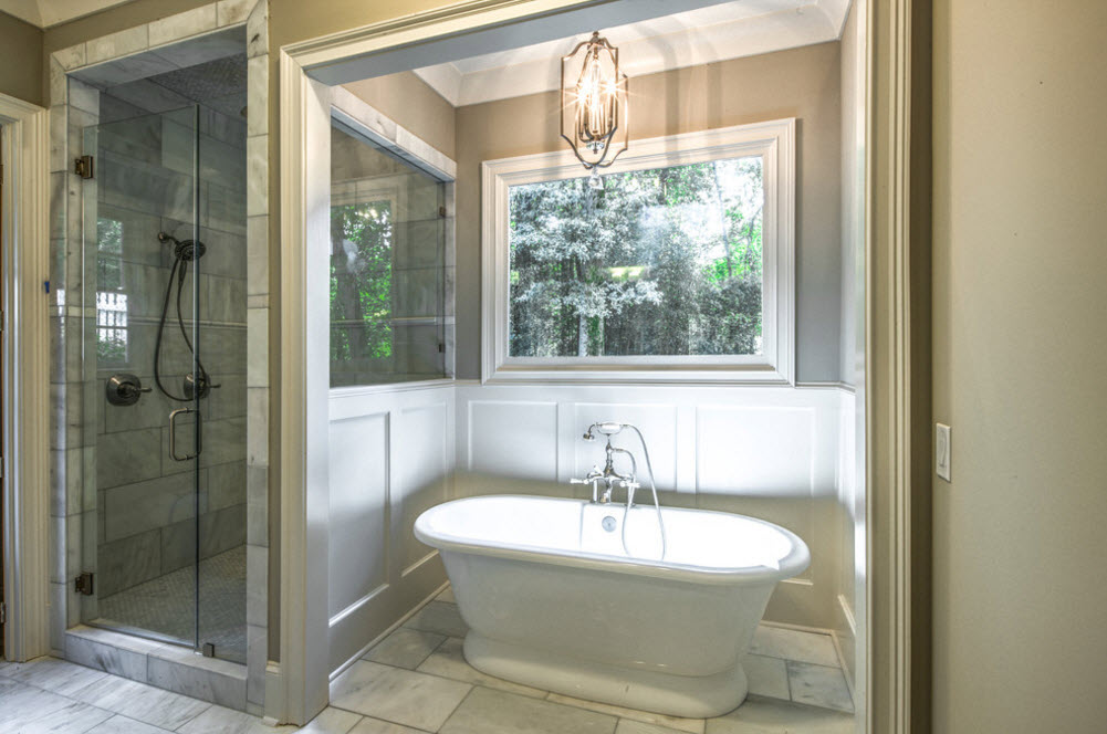 Стандартный совмещенный санузел «хрущевки» или любой другой малогабаритной квартиры – не для неоклассицизма. Ванная комната, в которой удастся отразить концепцию современной интерпретации исторического классицизма должна быть просторной и светлой. Ведь нам необходимо будет иметь возможность не только обеспечить помещение для водных процедур всем необходимым набором сантехники и систем хранения, но и показать красоту натуральных отделочных материалов, вычурность аксессуаров для ванны и раковин и даже роскошь осветительных приборов.