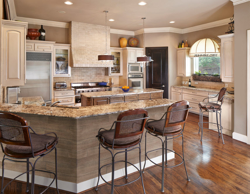 В неоклассической кухне, как и стиле исторической классики, важная каждая деталь. Не только внешний вид фасадов кухонного гарнитура и отделки поверхностей формирует образ кухни, но и выбор материала для столешниц, модели стульев и обеденного стола или барных табуретов у кухонного острова или стойки. Не меньшего внимания заслуживает успешная интеграция современной бытовой техники в пространство кухонного гарнитура. В отличии от классических направлений в оформлении кухонных пространств, бытовые приборы не закрываются фасадами кухонных шкафов, не прячутся от нашего взора, а составляют гармоничное сочетание технического прогресса с традиционным исполнением меблировки.