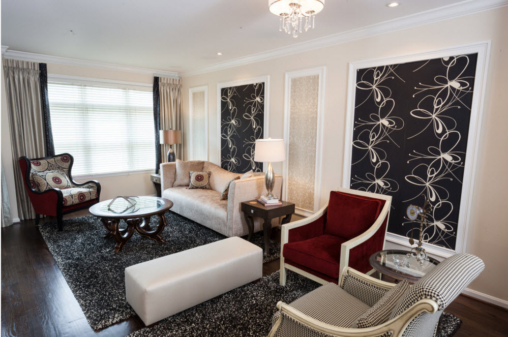 Гостиная в неоклассическом стиле наполнена функциональной роскошью. Строгая планировка гармонично соседствует с роскошью мебельной обивки, драпировки окон, блеском шикарной люстры и толстым ворсом дорогого коврового покрытия. При этом современные модели мебели, осветительных приборов и декоративных элементов успешно интегрируются в помещение, отделка которого создана на основе исторического классицизма, но с дозированием декора (лепнины, балюстрад, молдингов и карнизов).