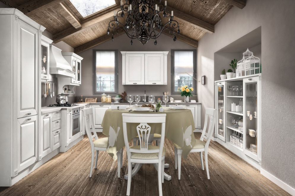 Палитра кухонного интерьера полностью отвечает характеру стиля: это сдержанный, но дорогой и благородный дизайн. Предпочтение отдается натуральному спектру – песочному, молочному, бледно-розовому, серому и др. Гармоничным дополнением будет перламутр и серебристые переливы. Они создадут необходимый антураж даже при использовании достаточно современной мебели. Хотя все-таки имеет право на существование.