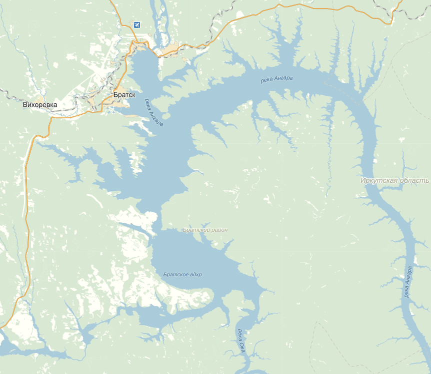 Населенные пункты на берегу: Братск, Свирск, Усолье-Сибирское, Вихоревка