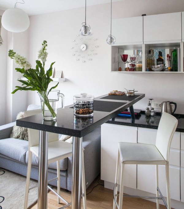 Кухня-студия – превосходный вариант, для тех, кто хочет сэкономить как можно больше места. Вы можете поэкспериментировать и заменить обеденный стол барной стойкой. Ведь в обычные дни вы вполне обойдетесь без него, в случае же, если к вам придут гости, вы можете воспользоваться раскладным.