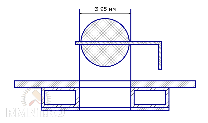Переходим к монтажу поддувала по аналогии с конструкцией дымохода, с той только разницей, что задвижной лепесток тут будет в виде сплошного кругляша, без вырезанной четверти, а длина трубы ∅ 95 всего 140 мм.