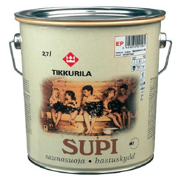 - Supi Saunasuoja – акрил с водной основой. Бывает бесцветным и прекрасно подойдёт, если вы задумываетесь, чем покрасить вагонку внутри бани;