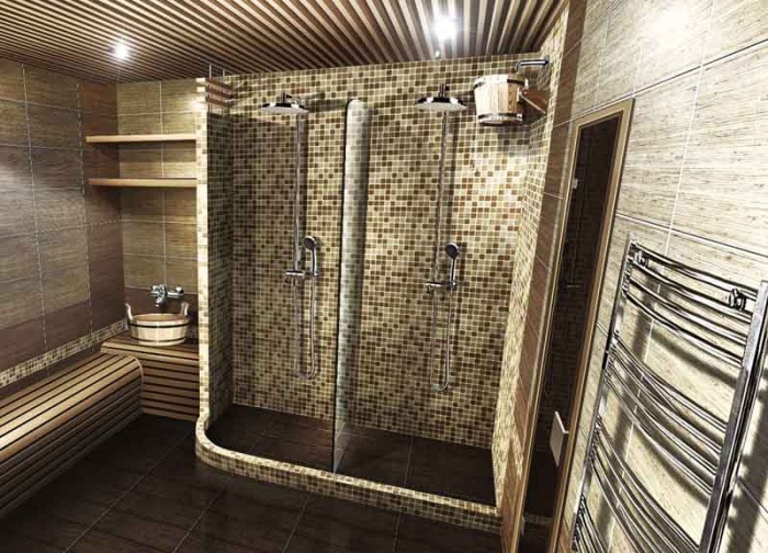 Само помещение должно иметь размеры не меньше четырех квадратных метров. Это должна быть не просто душевая, а комната, в которой можно по необходимости отдохнуть, сделать массаж. Обязательно в комнате должна находиться небольшая лавочка. Можно приобрести как уже готовый вариант, так и сделать ее самому. При этом лавочка должна быть комфортной, чтобы на нее поместился даже самый крупный человек.