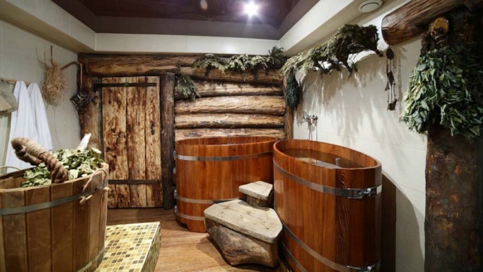 Для украшения интерьера можно использовать необычные расписные кадки или ковши, резные вешалки для мочалок. Хорошо смотрятся резные лавки разного размера.