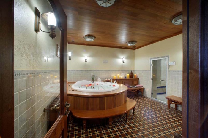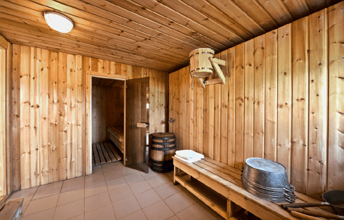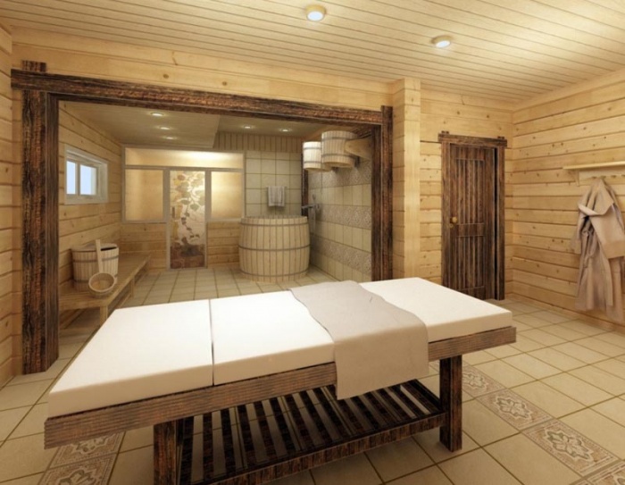 Внутренняя отделка может включать бассейн, если постройка просторная. В помещении должно находиться несколько душевых кабинок. Хорошо, если выход комнаты ведет прямо в зону отдыха.