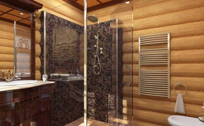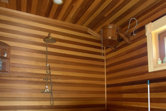 • Отделка душевой в деревянной бане тоже может выполняться вагонкой, но в этом случае нужна хорошая приточно-вытяжная вентиляция, чтобы доски сохли после окончания процедур. Их необходимо обработать влагоотталкивающим средством и периодически обновлять покрытие.