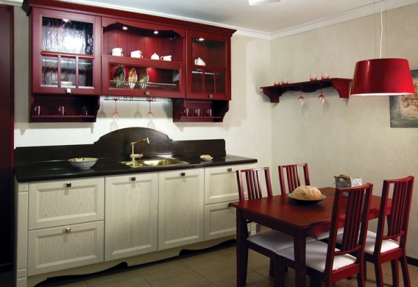- Стиль прованс, кантри и другие деревенские мотивы нечасто используют на кухне красно-белую палитру. Исключительно редко встречающиеся случаи представляют изысканные дизайнерские решения красного гарнитура из дерева. Удовольствие дорогостоящее, но впечатление производит неизгладимое.