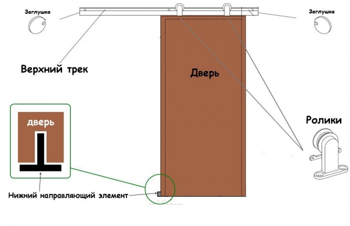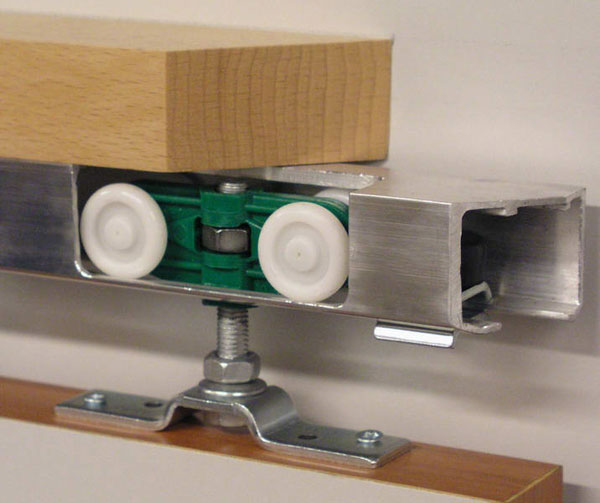 Сам крепеж двери очень прост, помимо самих роликов и рельсы в комплект входят заглушки и крепежи. Изделие с верхним рельсом имеет крайне низкие показатели звукоизоляции. Поэтому не рекомендуется использовать такие конструкции в жилых комнатах.