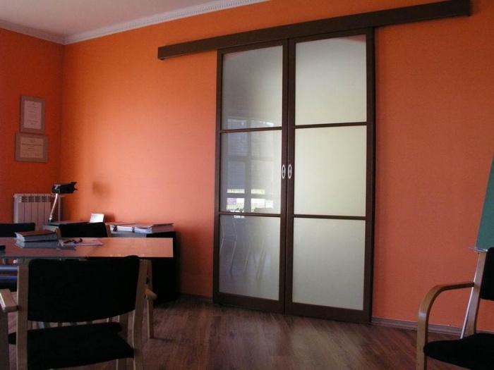 Наиболее популярным вариантом является установка раздвижных дверей между двумя жилыми зонами. Используя двустворчатый тип дверей, можно зонировать помещение, сохранив его целостность. При закрытых дверях это будут два разных помещения, а при открытых — одно, но с большой площадью. Например, установив раздвижные двери, можно отделить небольшой рабочий кабинет, а при открытых дверях — это будет общее помещение для деловых переговоров.