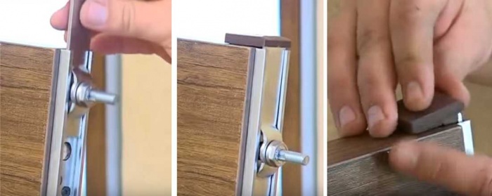В комплекте с роликами идут штыри. На них накручивают сами движимые элементы. Если модель не оснащена ручками — их приобретают отдельно. Монтировать ручки рекомендуется до установки изделия в проем. В модели без паза делают разметку карандашом и столярным инструментом удаляют материал по контуру. В образовавшееся отверстие крепят фурнитуру.