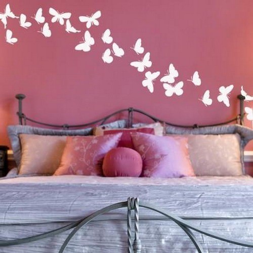 Или использовать трафареты бабочек на стену, с помощью которых можно наносить краску по уже готовым формам. Кстати, если использовать люминофорную краску, то бабочки и вовсе выйдут светящимися. Но для такого украшения подойдет только белая стена, при этом рядом с ней необходимо обеспечить какой-нибудь источник света.