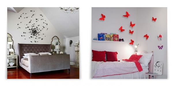 Декоративные бабочки будут прекрасно смотреться в детской комнате у девочки. Разноцветные красавицы, окружающие маленькую принцессу, будут способствовать развитию ее фантазии, а также избавят ее от негативных эмоций и впечатлений. Они могут располагаться на настенном панно, постельном белье, потолке. Они могут быть выполнены в виде рисунков, наклеек, бумажных аппликаций и даже сделаны из гипса.