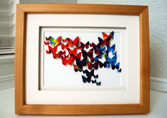 Бабочек называют крылатыми цветами, они способны придать помещению воздушности и некой ветрености. Изготовить панно из бумажных бабочек очень просто. Самый простой вариант – картина с приклеенными бумажными бабочками.