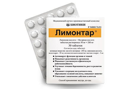 Лимонтар – это смесь из лимонной и янтарной кислот. Чтобы на празднике не опьянеть, необходимо выпить 1 табл. за 20–60 минут до приема крепкого алкоголя. Как и сукцинаты, препарат активизирует цикл Кребса, ускоряет эвакуацию ацетальдегида, что предупреждает развитие абстинентного синдрома. Таблетку размельчить и растворить в 200 мл теплой воды, если в стакан не добавить немного пищевой соды, то можно заработать изжогу. Средство обладает антигипоксическим и антиоксидантным эффектами, нивелирует токсическое воздействие алкоголя на ЦНС, клетки печени, органы брюшной полости. Лимонтар также применяют для лечения хронического алкоголизма.