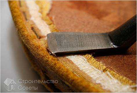 Затем плоской отверткой поддеваете скобы, крепящие старую ткань, и извлекаете их пассатижами. Старую обивку сразу не выбрасывайте — она еще пригодится в качестве лекала для раскройки нового обивочного материала. Затем таким же способом снимаете подкладочную ткань и набивку.