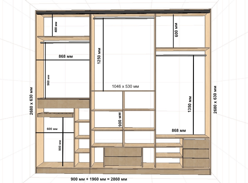Схема внутреннего пространства шкафа-купе формируется исходя из таких размеров: