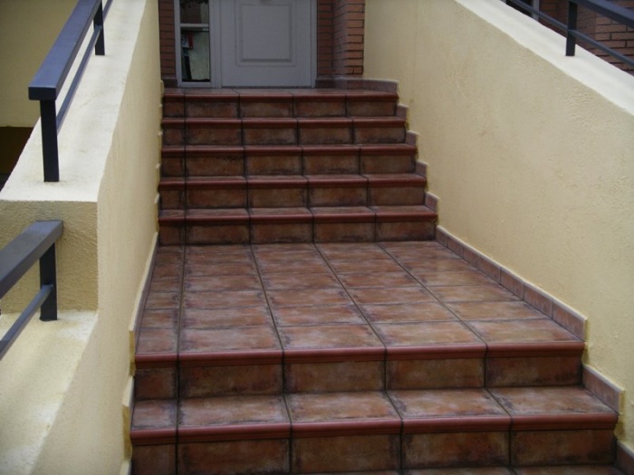 Облицовка ступеней керамической противоскользящей плиткой (используется при облицовке крылец, некоторые образцы даже нейтрализуют несильное обледенение).