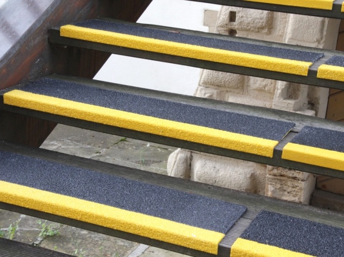 Универсальные средства, обеспечивающие надежную защиту от скольжения, – самый легким вариантом обеспечить безопасность, который подходит, если скользко на улице, и который не требует проведения каких-либо специальных работ. Применение этих средств не нарушает целостность конструкции и профиль ступеней.