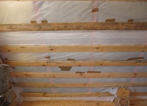 Иногда строители стелят первую влагоизоляционную пленку поверх досок чернового потолка, обходя каждую балку. Мы не рекомендуем применять такой подход — пароизоляция закроет доступ воздуха к древесине лаг, а снизу она останется открытой для насыщения паром. Дальше ясно — дерево станет гнить.