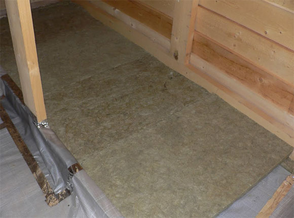 - Перекрытия из дерева лучше изолировать со стороны чердака базальтовой ватой, керамзитом, вермикулитом либо смесью глины с опилками.