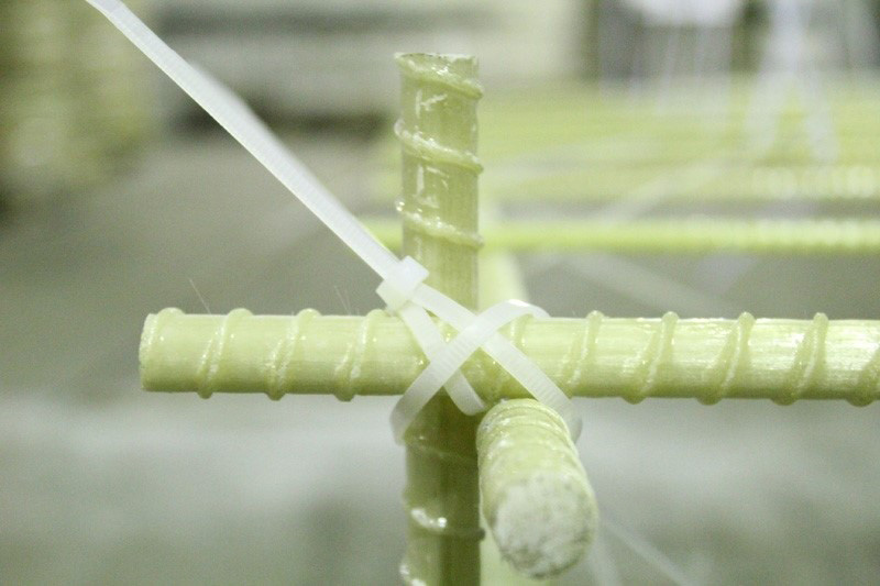 Для мастера, имеющего опыт работы с обычной арматурой, армирование композитными материалами не доставит никаких сложностей. Как и при работе со стальными прутками, диаметр стержней и размер ячеек при укладке композитной арматуры определяется расчётом исходя из требуемой несущей способности конструкции. Арматурные стержни в случае заливки монолитных конструкций размещаются в опалубке с определённым шагом и увязываются между собой вязальной проволокой или обычными электротехническими пластиковыми хомутами нужной длинны. Последний вариант возможен благодаря небольшой массе прутков арматуры.