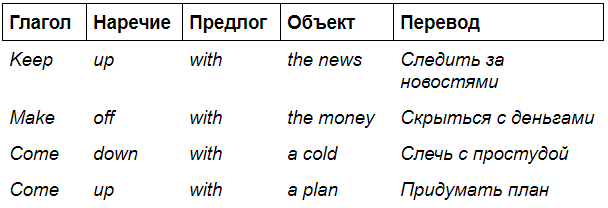 - Глагол + наречие + предлог + объект.