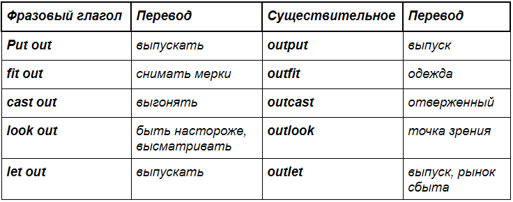 Любопытно, что в фразовых глаголах наречие или предлог всегда стоит после глагола. А в существительных, которые были образованы от этих глаголов, наречие почти всегда находится впереди.