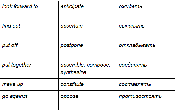 Почти все фразовые глаголы так или иначе имеют более официальный аналог, использующийся в формальных речах и переписках.