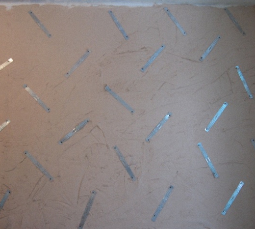 В некоторых случаях следует использовать армирующую сетку под оштукатуривание. Такая необходимость обычно появляется во время ремонта стен в ванной или на кухне, где впоследствии будет укладываться керамическая плитка, или когда усредненный слой штукатурки по всей стене превышает 10 мм. Армирующую сетку можно либо прихватить с помощью дюбелей, либо закрепить небольшим слоем раствора (сетка из стекловолокна, полиэтиленовые сетки).