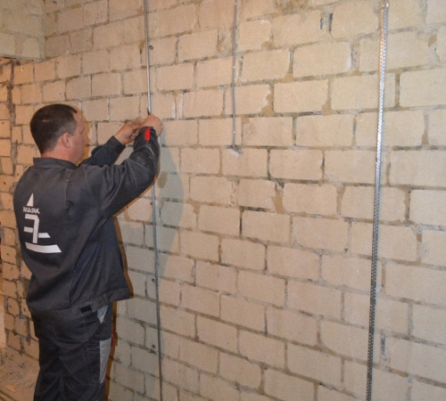 - Маяки готовы и укреплены. Приступают к штукатурке стен под маяк.