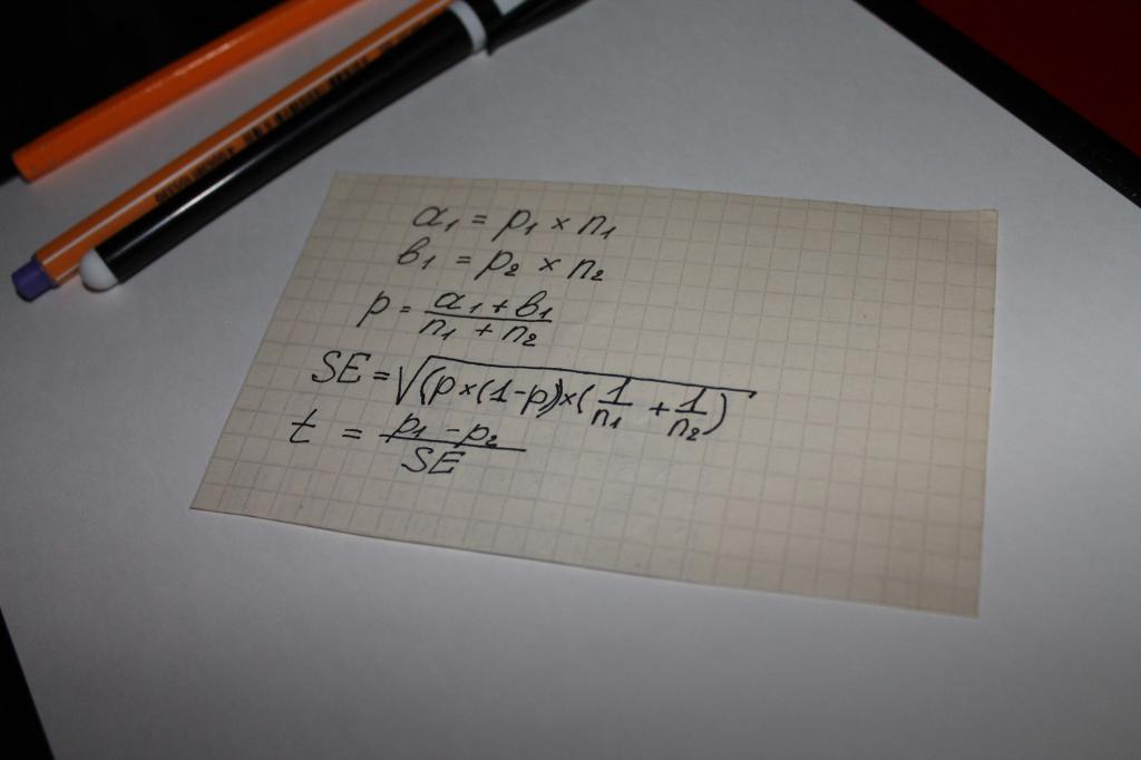 Следующим этапом определяется общий тестовый показатель — t, его значение сравнивается с числом 1,96. 1,96 — это усредненное значение, передающее диапазон в 95 %, согласно функции t-распределения Стьюдента.