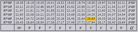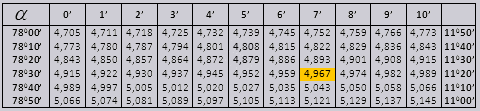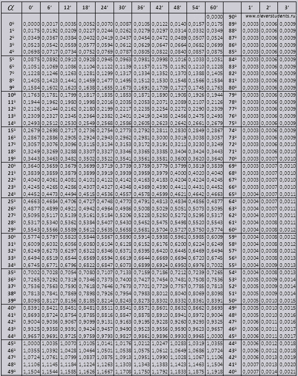 Найдем обозначение sin (обозначение в столбце с левого края) 42 минут (обозначение находится на верхней строчке). Путем пересечения ищем обозначение, оно = 0,3040.Величины минут указаны с промежутком в шесть минут, как быть если нужное нам значение попадет именно в этот промежуток. Возьмем 44 минуты, а в таблице есть только 42. Берем за основу 42 и воспользуемся добавочными столбцами в правой стороне, берем 2 поправку и добавляем к 0,3040 + 0,0006 получаем 0,3046.При sin 47 мин, берем за основу 48 мин и отнимаем от нее 1 поправку, т.е 0,3057 — 0,0003 = 0,3054При вычислении cos работаем аналогично sin только за основу берем нижнюю строку таблицы. К примеру cos 20 0 = 0.9397Значения tg угла до 90 0 и cot малого угла, верны и поправок в них нет. К примеру, найти tg 78 0 37мин = 4,967а ctg 20 0 13мин = 25,83