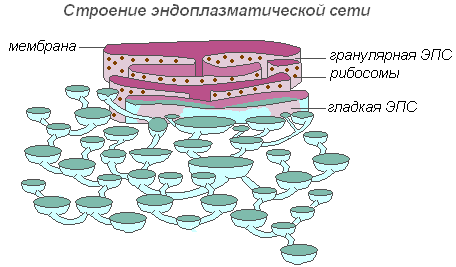Вся сеть объединена в единое целое с наружной клеточной мембраной ядерной оболочки. Различают ЭПС гладкую и шероховатую, несущую на себе рибосомы. На мембранах гладкой ЭПС находятся ферментные системы, участвующие в жировом и углеводном обмене. Этот тип мембран преобладает в клетках семян, богатых запасными веществами (белками, углеводами, маслами), рибосомы прикрепляются к мембране гранулярной ЭПС, и во время синтеза белковой молекулы полипептидная цепочка с рибосомами погружается в канал ЭПС. Функции эндоплазматической сети очень разнообразны: транспорт веществ как внутри клетки, так и между соседними клетками; разделение клетки на отдельные секции, в которых одновременно проходят различные физиологические процессы и химические реакции.