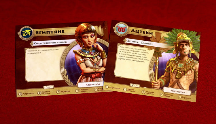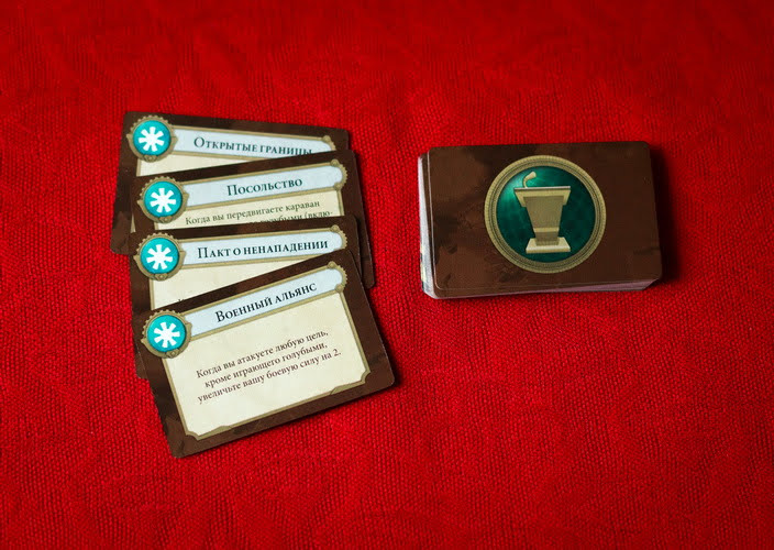 В качестве разнообразия игра может предложить разные фрагменты игрового поля, разные карты целей и разные планшеты предводителей. Что я могу сказать о предводителях? В игре их всего 8 штук. Предводители отличаются стартовой раскладкой карт действий и уникальным свойством. Разные стартовые раскладки карт нужны для того, чтобы действия игроков отличались друг от друга с самого старта. Уникальное свойство позволяет игроку делать что-то более эффективно. Например, давать бонус против варваров, двигать караваны из любого своего города, давать бонус к постройке чудес света, уменьшать требования к строительству городов и выставлению жетонов контроля. Честно говоря, некоторые свойства предводителей мне кажутся интереснее других, поэтому перед игрой я бы все-таки их драфтил, а не раздавал случайным образом.