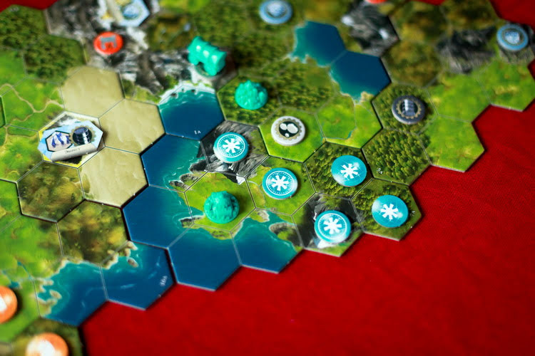 Поле собирается из фрагментов, поэтому у игроков будет возможность перед партией собирать каждый раз новую карту. Это, конечно же, большой плюс, т.к. перед игрой никто из игроков не знает, с чем ему предстоит встретиться на карте. Может быть возле вашей столицы будет находится чудо природы, а может пристанище варваров или город-государство. Может быть ваша столица окажется в центре карты, а может и на ее краю.