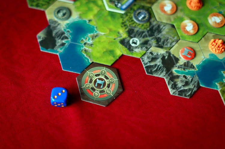 Давайте подробнее остановимся на стартовых картах действий, на примере которых я объясню эффективность розыгрыша карты в том или ином положении в ряду. Каждая карта действий отвечает за конкретный тип действий. Культура позволяет класть на соседние с городом клетки жетоны контроля, присоединяя новую территорию и захватывая ценные ресурсы (чем выше номер карты, тем более сложные гексы можно захватывать). Наука увеличивает значение счетчика технологий игрока; при достижении определенных уровней, можно получать новые карты действий, которые выкладываются взамен старых (новые карты технологий более крутые, чем старые); чем выше номер карты, тем больше очков технологии получает игрок. Экономика позволяет двигать миньки караванов в города-государства и города других игроков, зарабатывая при этом ценные жетоны торговли и получая карты дипломатии (чем выше номер карты, тем более сложные местности может проходить караван). С помощью ремесла строят новые города или чудеса света, дающие ценные бонусы (чем выше номер карты, тем больше очков может потратить игрок на новое чудо света). Война либо усиливает жетоны контроля игрока, либо позволяет атаковать варваров, города-государства или чужие жетоны контроля (чем выше номер карты, тем больше показатель боевой силы игрока).