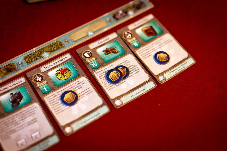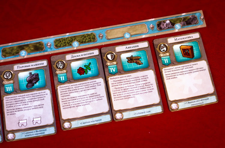 Именно она станет для вас сердцем всей игры. Помимо этого каждому достается стартовый комплект жетонов, приятных пластиковых фигурок (города и повозки), карт дипломатии и диск технологии. Апогеем всей подготовки является вскрытие выкладыванием трех (или четырех) из пяти доступных карт, на которых приведены победные условия (по два на каждой из них, но игроку суждено выполнить лишь по одному с каждой). Ход игрока строится вокруг панели технологии, которая представлена рядом действий и пяти карт, выложенных под ним. Вначале вы выполняете действие с одной из них, выполняет, указанное на ней, а затем «перезаряжает» ее, перемещая ее на первый слот ряда, а все прочие сдвигает вправо. Чем более правое положение занимает то или иное действие, тем оно мощнее.После этого ход передается следующему игроку. Ключевая стратегия игры состоит в том, чтобы понять, когда применять действия на первых ячейках, а когда стоит подождать, чтобы карта смогла бы дать максимальный эффект.