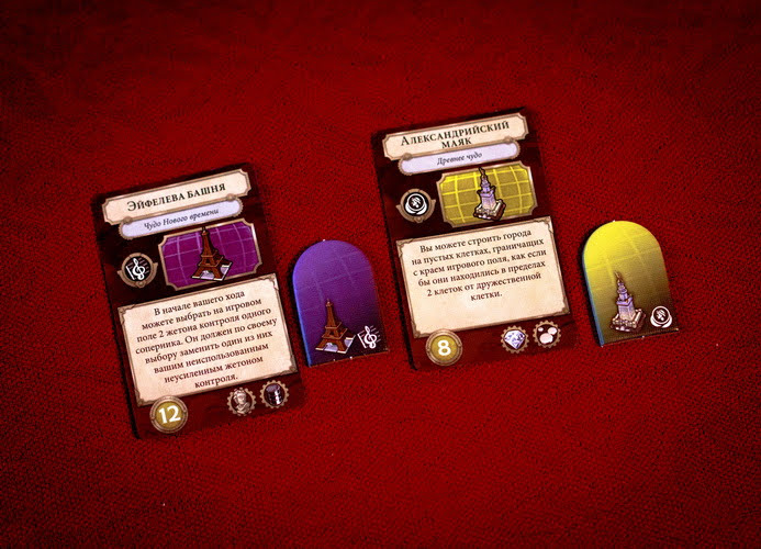 В чудесах света мне понравился один прикольный момент. Их можно друг у друга отбивать. Когда вы строите чудо света, вы берете соответствующий жетон и подкладываете его под один из своих городов. Если ваш город разрушит другой игрок и на руинах возведет свой город, то чудо света не разрушается, а переходит под контроль другого игрока. Поэтому совсем необязательно думать, как находить очки для строительства чуда, ведь его можно просто забрать у соседа=)
